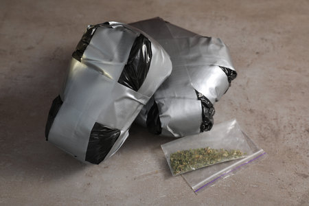 Packages with drugs on gray textured table