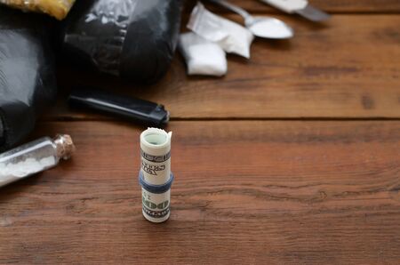 Roll of hundred dollar bills on background of narcotic drug dealer stuff. Concept of heavy drug addiction and amphetamine trafficking in USA