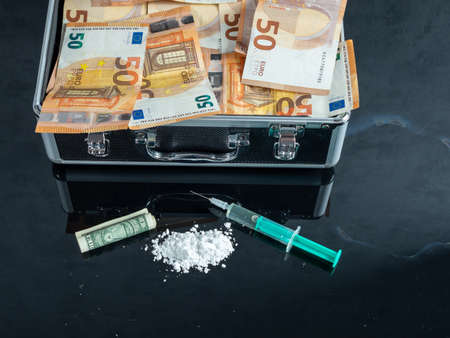 Drug syringe, narcotic dangerous,drug abuse,pay money for drugs concept.