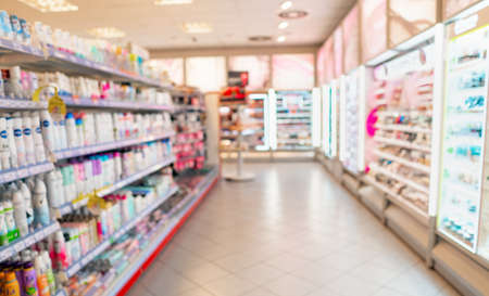 Blur pharmacy shelves (chemist and cosmetic shop) for background