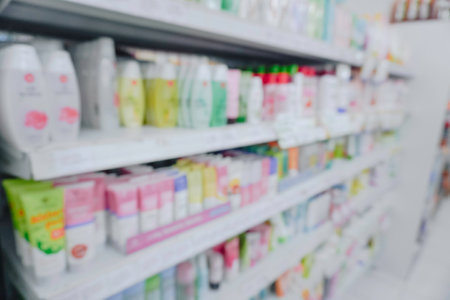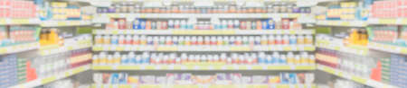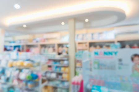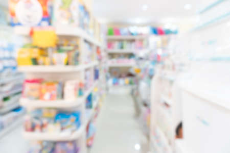 abstract background blur shelf with medicines and other goods in pharmacy store