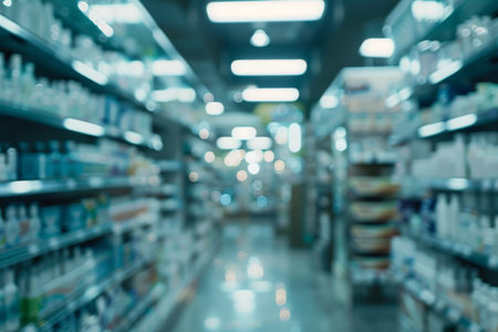Blurred view of pharmacy with medicine racks, clean design, bright lights