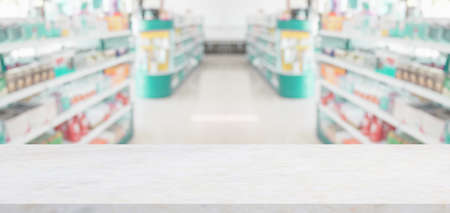 Empty white marble counter top with blur pharmacy drugstore shelves background