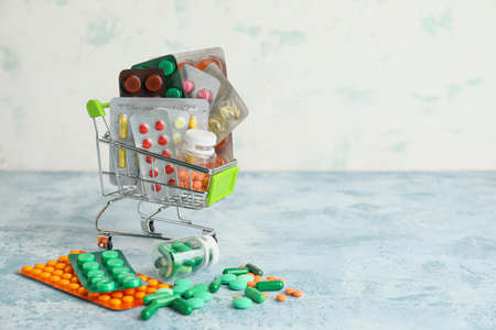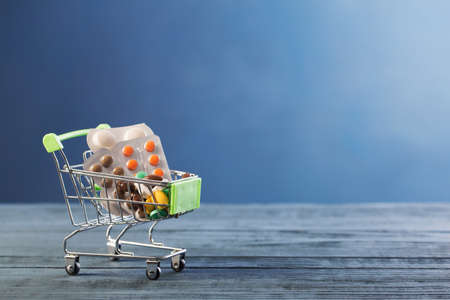 Purchase of pills and various medicines. An idea for healthcare and pharmaceutical company. Trolley with medicines on blue background close-up.