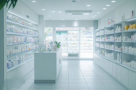 Interior view of a sleek and modern pharmacy shop with an empty aesthetic background