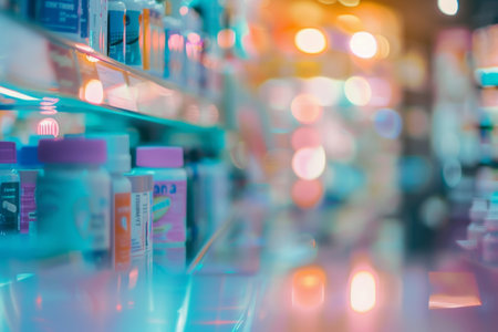Out-of-focus pharmacy aisles with shelves stocked with medicines
