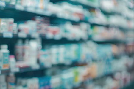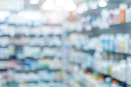 Pharmacy scene with blurred medicine shelves, clean layout, soft background blur