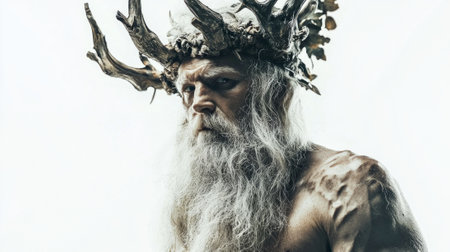 A wise forest spirit gazes intensely, adorned with antlers and forest elements, in a lush green environment.