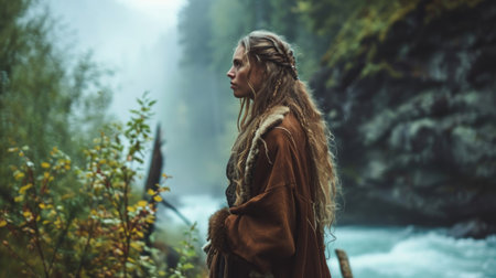 Portrait of a beautiful shamanic woman with long hair in the mountains
