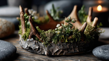 A beautifully crafted rustic wooden crown showcasing moss and delicate flowers, perfect for nature-inspired decor. The tranquil scene evokes serenity and artistry.