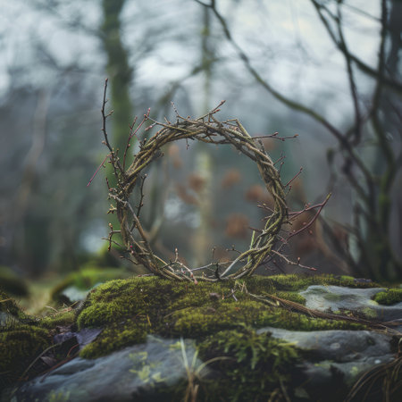 Discover a captivating scene featuring an intricate crown made of branches nestled among vibrant greenery, shrouded in gentle fog, evoking a sense of mystery and tranquility.