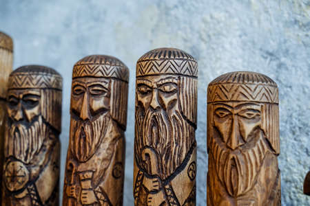 A close shot of wooden carved figures of Slavic idols. Totems made of natural material. Toys made of wood. High quality photo