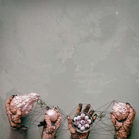 Creative Halloween background. Hands in black mesh gloves hold pink decorative pumpkins and chocolate eyes. Hands are tied up with black string in cat's cradle with spiders.