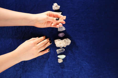 Top view female hands with black nails lying on table with gem stones. Blue velvet background.