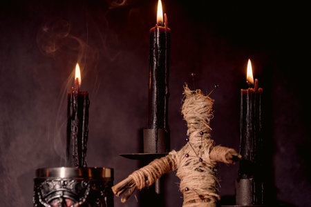 Scary voodoo doll with black candles. Mystic background with ritual esoteric objects, occult and halloween concept.