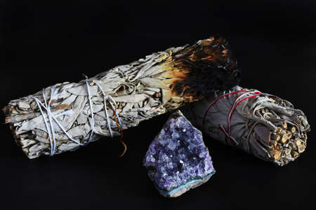 A close up image of two white sage bundles and amethyst geode on a black background.