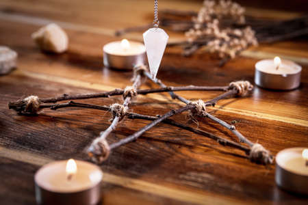 Wooden pentagram and a pendulum with candles, occultism and magic, closeup