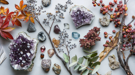 Explore a captivating flatlay of vintage curiosities, mixing natural elements and mystical artifacts, perfect for artistic projects or home decor inspiration.