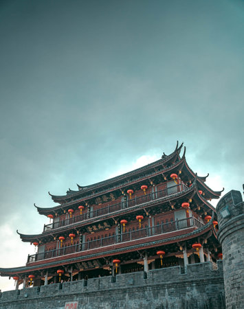 A magnificent architectural marvel from ancient China adorned with beautiful lanterns