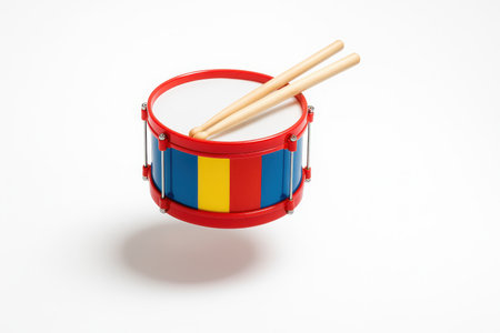 Bright colorful toy drum with striped body and lightweight wooden sticks captured in gentle mid air above a faint shadow ellipse