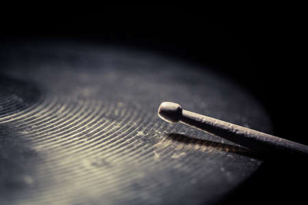 plays a drum stick on the hi-hat or ride cymbal, drums, percussion musical instrument, photo closeup
