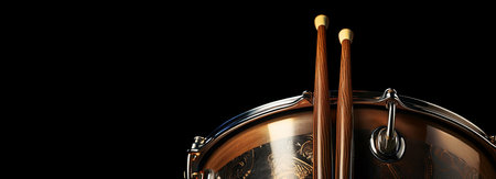 Extreme close-up of two wooden drumsticks and an old metallic snare drum isolated on black background with copy space. Percussion instrument concept. Generative Ai.