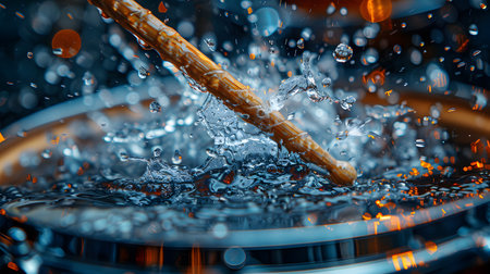 A stunning close-up of wooden drumsticks on a snare drum, showcasing the reflective surface with water droplets, highlighting the artistry of music and rhythm.