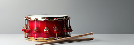 A traditional red drum with hanging beads and golden accents, paired with matching drumsticks, centered on a white surface -