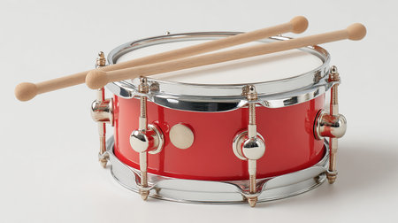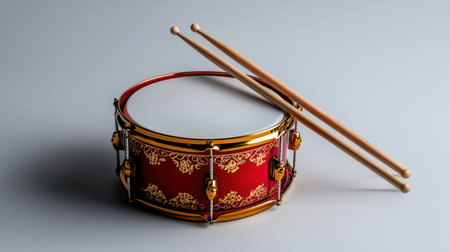 A small red drum with golden patterns, accompanied by wooden drumsticks, resting on a white surface