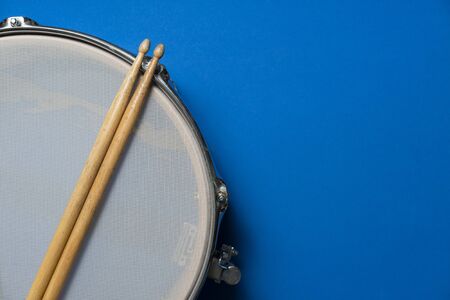 Drum stick and drum on blue table background, top view, music concept