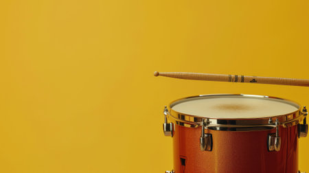 Orange drum with a drumstick against a yellow background