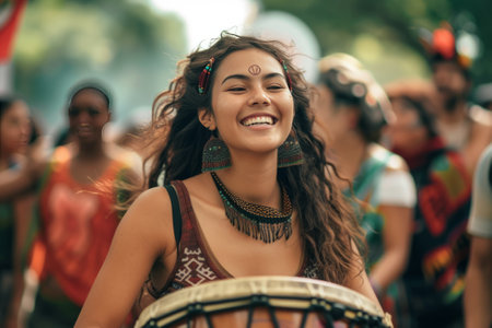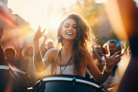 A young woman playing a drum at a protest, her face alight with determination and happiness.
