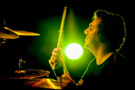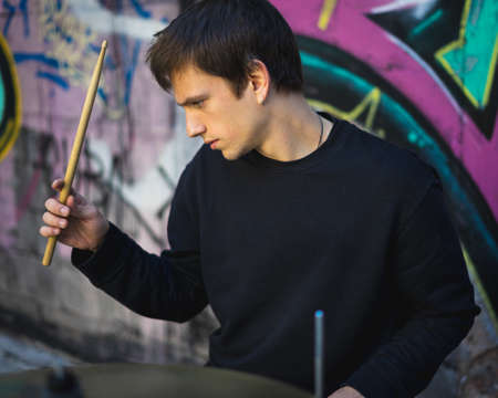 Rock band musician with drumsticks playing on cymbal on blurred foreground