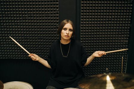 portrait of a cheerful rock n roll drumming girl holding sticks in her hands. Musician in black. On a dark background happy drummer woman with drum sticks