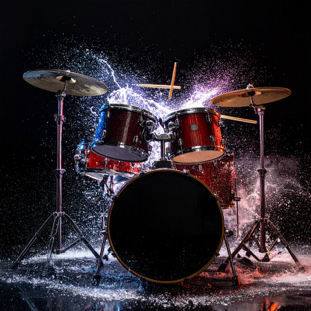 man plays musical percussion instrument with sticks with water splashes close up on a black background, play at the drum, red and blue lighting on the stage.