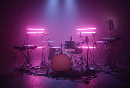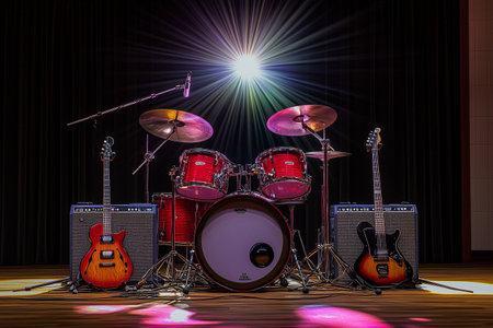 Captivating image of drums and guitars set for a live performance, illuminated by dazzling lights, embodying the energy and excitement of a musical event on stage.