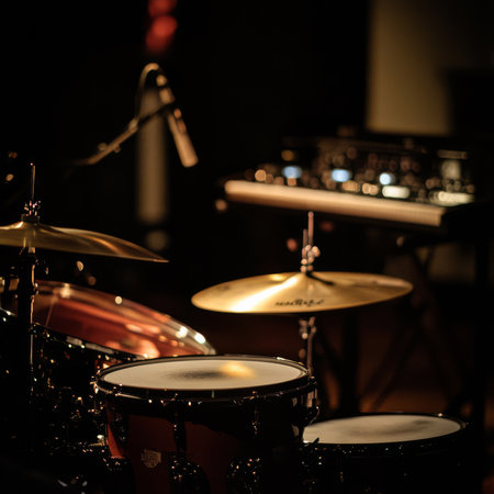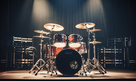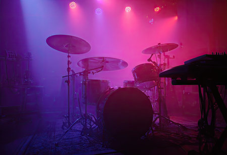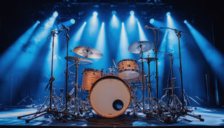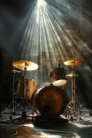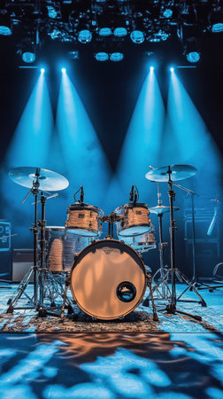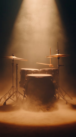 Drum set illuminated by a warm spotlight on a smoky stage, creating a dramatic atmosphere for an upcoming live performance, capturing the essence of music and entertainment