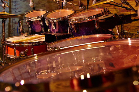 Live music background. Drumset on stage.Concert and show entertainment.Drum on stage and festive event