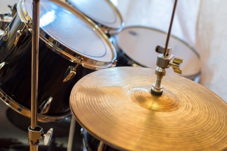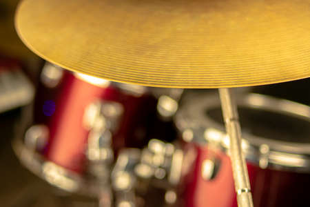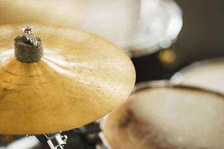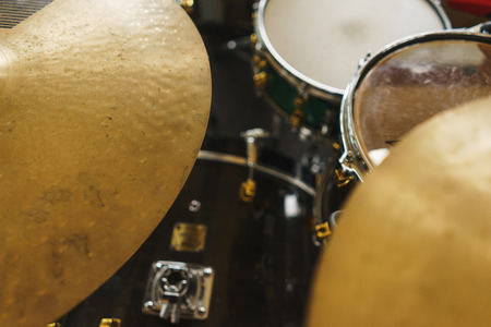 A set of plates in a drum set. At a concert of percussion music, selective focus, close-up