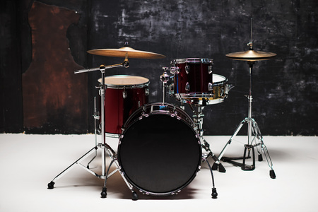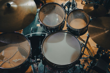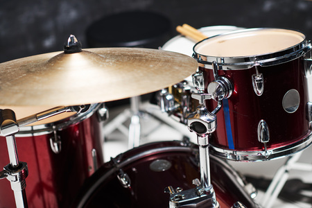 Closeup professional musical instrument. Drum kit for jazz band in recording studio. Drumsticks lying on drum. Drum set with drum cymbals.