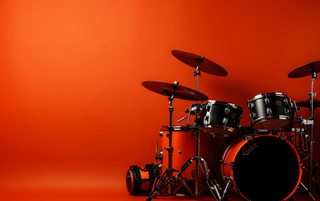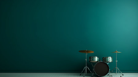 modern drum kit in an empty room, featuring a minimalist blue-green color scheme. this stock photo captures the essence of contemporary design with its dark green and dark aquamarine backdrop. the high level of detail and the inclusion of dark green and maroon elements add depth to the image, making it a perfect choice for wallpaper or any modern-themed project. ai generated