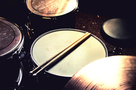 Drums conceptual image. Picture of drums and drumsticks lying on snare drum. Retro vintage instagram picture.