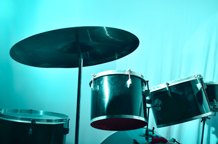 Drums and drum set. Beautiful blue and red background, with rays of light. Beautiful special effects of smoke and lighting. Musical instrument. The concept of music. Close-up photo.