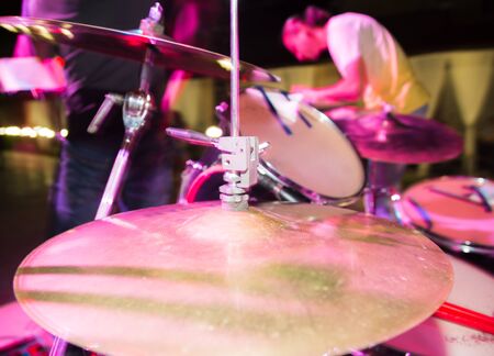 Drummer playing on drum kit on stage. Close-up of plate, drums, sticks, in background scene spotlights