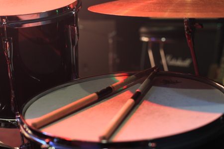 Closeup of drumsticks lying on the drum set. Drummer equipment