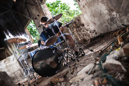 Musician plays drums in a rock band .