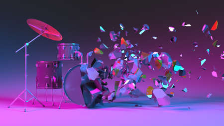 half destroyed drum kit with flying debris in neon lighting, 3d illustration