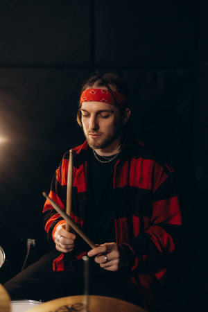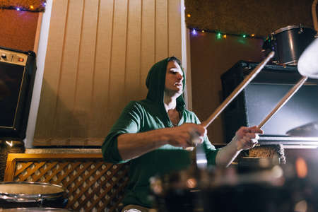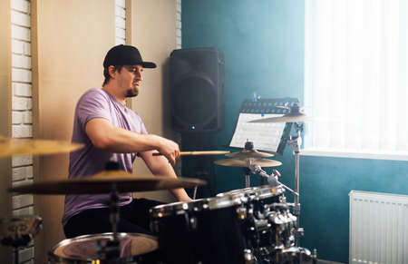 Drummer rehearsing on drums before rock concert. Man recording music on drum set in studio