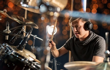 music, people, musical instruments and entertainment concept - male musician in headphones with drumsticks playing drum kit at concert or studio over holidays lights background