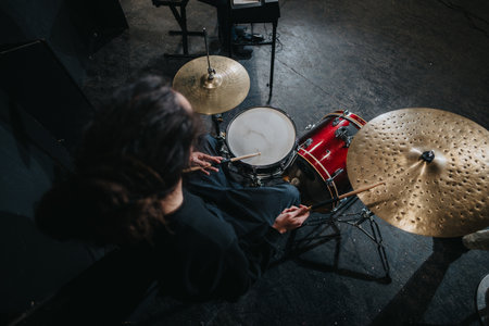 Musician Playing Drums in a Dark Studio with Professional Equipment